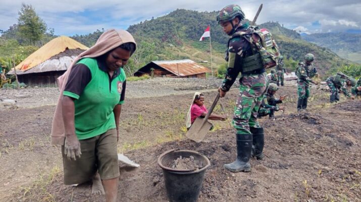 Puncak Jaya, Papua Tengah — Suasana kebersamaan terasa begitu kental di Kampung Wuyuneri, Kabupaten Puncak Jaya, saat Prajurit Satgas Pamtas RI-PNG Kewilayahan Yonif 743/PSY