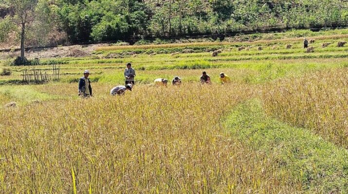 SUMBA BARAT – Babinsa Sertu Husni Koramil 01/Loli melaksanakan kegiatan komunikasi sosial dengan masyarakat yang sedang melaksanakan panen padi di Desa Malata, Kecamatan Tanarighu,