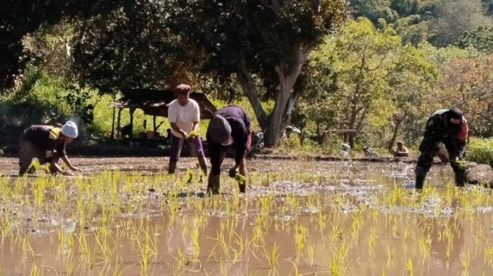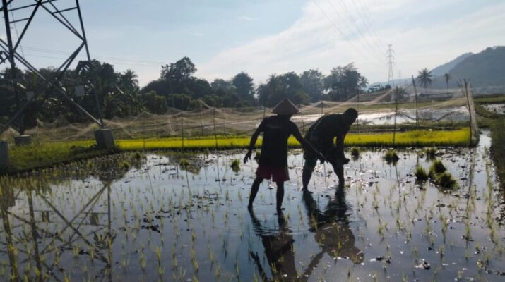 Ende – Dalam rangka mendukung ketahanan pangan nasional, Koramil 1602-04/Maurole melalui Babinsa Desa Woloau, Praka Ramdani G. Utomo, melaksanakan kegiatan tanam padi bersama masyarakat