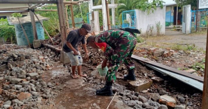 NTT-SIKKA Babinsa Koramil 1603-01/Alok Jajaran Kodim 1603/Sikka, Sertu Simon Nur Hence, melaksanakan kegiatan pembangunan aula di Desa Koting, Kecamatan Koting, Kabupaten Sikka, Sabtu(23/08/2025). Kegiatan