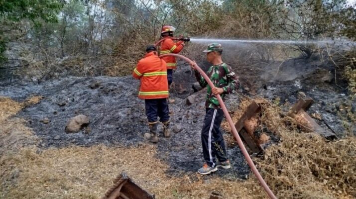 KARANGASEM – Babinsa Koramil 1623-08/Kubu Sertu Kadek Marsi bersama Damkar Kab.Karangasem bahu membahu melaksanakan pemadaman api kebakaran lahan milik warga, di Dusun Darma Winangun