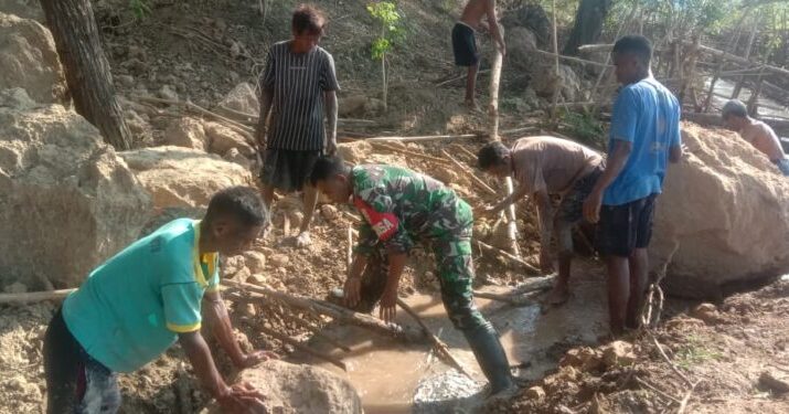 TTS _ Dalam rangka menjaga kelancaran irigasi dan mendukung produktivitas pertanian, Babinsa Koramil 02/Abanteng Jajaran Kodim 1621 TTS bersama masyarakat setempat melakukan kerja bakti