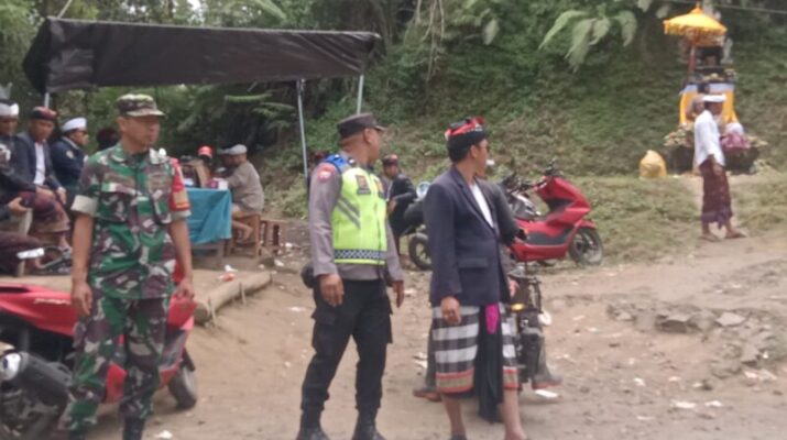 Bangli – Babinsa Desa Sukawana, Sertu Nyoman Budiarta, bersama Bhabinkamtibmas Desa Sukawana dan Pecalang Adat Sukawana melaksanakan pengamanan kegiatan Piodalan di Pura Bunga, Desa