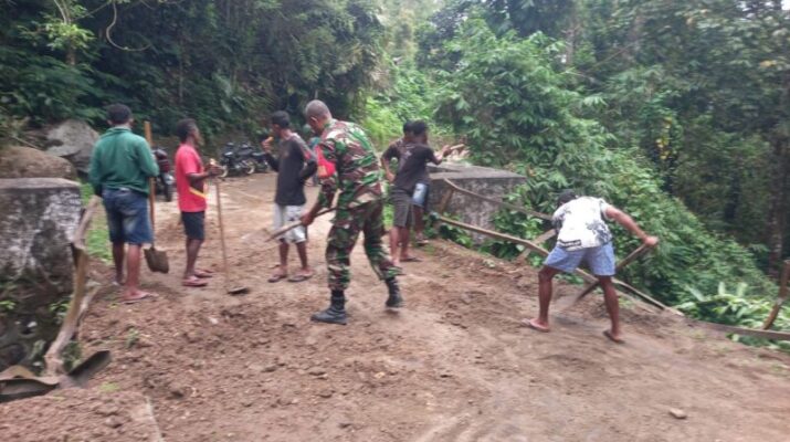 NTT-SIKKA Wujud kemanunggalan TNI dan rakyat kembali terlihat di Desa Wolomotong, Kecamatan Doreng, Kabupaten Sikka. Babinsa Koramil 05/Bola Kodim 1603/Sikka, Sertu Fonseca, bersama warga