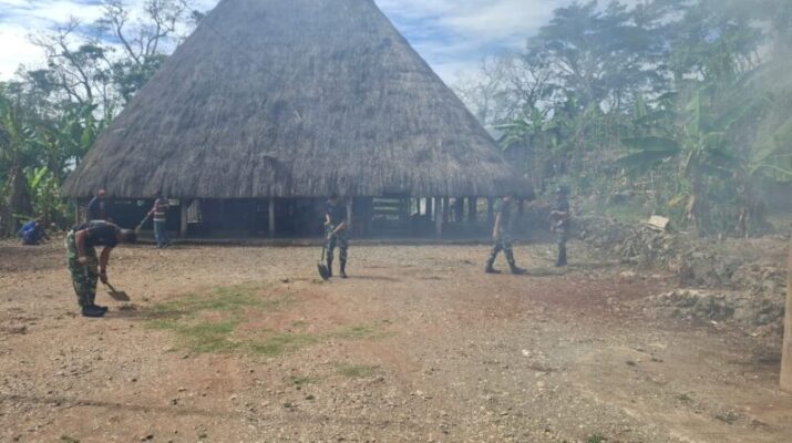 Belu – Personel Pos Turiscain, Pos Delomil, dan Pos Kewar melaksanakan karya bakti pembersihan Rumah Adat Dirun, di Dusun Nuawain, Desa Dirun, Kecamatan Lamaknen,