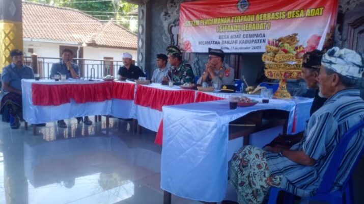 Banjar – Babinsa Desa Cempaga bersama Danramil 1609-06/Banjar Kapten Inf Made Suparsana menghadiri rapat koordinasi Sipandu Beradat (Sistem Pengamanan Terpadu Berbasis Desa Adat) yang