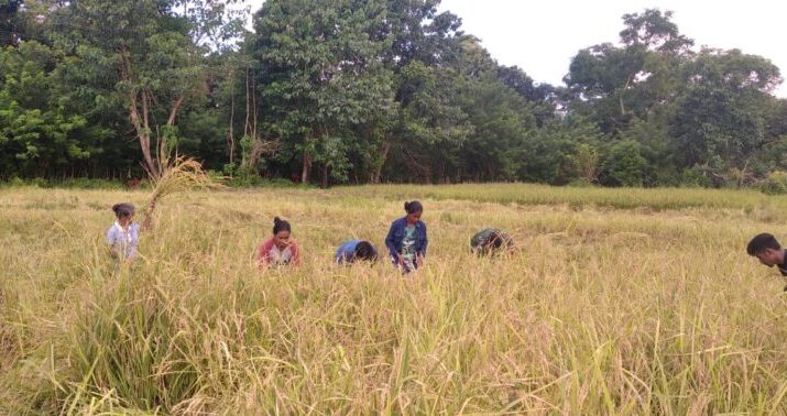Babinsa Koramil 06/Karera Kodim 1601/Sumba Timur, Pratu Aldith, melaksanakan pendampingan kepada petani dan ikut membantu warga dalam kegiatan gotong royong panen padi di Dusun