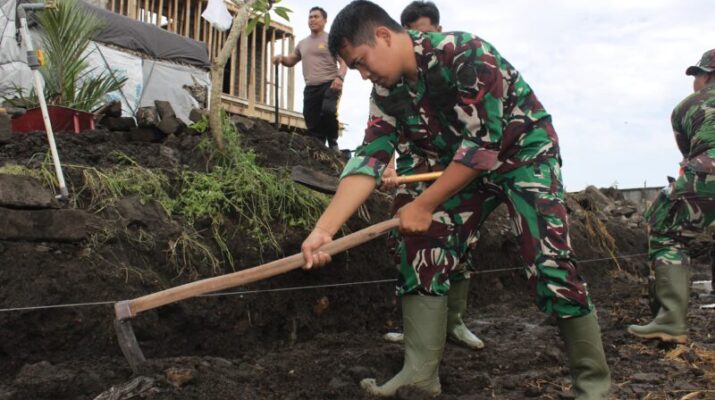 Tabanan – Personel Koramil 1619-05/Kerambitan diterjunkan dalam kegiatan karya bakti membantu masyarakat membersihkan material tanah longsor yang menutupi badan jalan di Desa Belumbang, Kecamatan