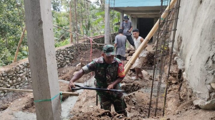Ende, Babinsa Koramil 1602-01/Ende, Serka Iginu Lopes, bersama masyarakat Desa Tanazozo, Kecamatan Nangapanda, Kabupaten Ende, melaksanakan kegiatan karya bakti pembangunan Aula Serba Guna di