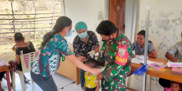 NTT-KUPANG, – Babinsa Desa Tuakau, Koramil 1604-05/Sulamu, Sertu Jackson Paulus Tuka bersama tenaga kesehatan Kecamatan Fatuleu Barat dan pengurus Posyandu Mekar melaksanakan kegiatan rutin