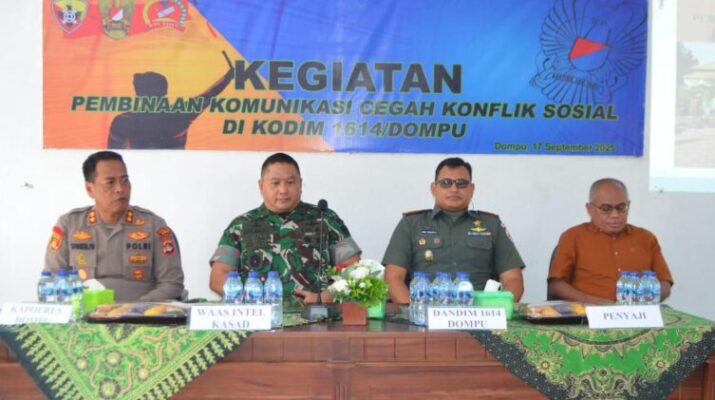 Dompu, NTB — Kodim 1614/Dompu menggelar kegiatan Pembinaan Komunikasi Cegah Konflik Sosial pada Senin (17/9/2025) di Aula Makodim 1614/Dompu, Jalan Ahmad Yani, Kecamatan Dompu.