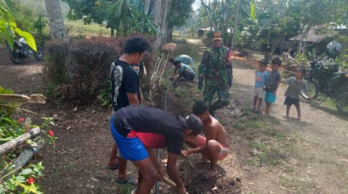 SUMBA BARAT – Babinsa Koramil 01/Loli Kodim 1613/Sumba Barat, Sertu Mursidi, bersama warga masyarakat melaksanakan kegiatan gotong royong menanam pipa sumur bor di Desa