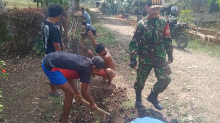 SUMBA BARAT – Babinsa Koramil 01/Loli Kodim 1613/Sumba Barat, Sertu Mursidi, bersama warga masyarakat melaksanakan kegiatan gotong royong menanam pipa sumur bor di Desa