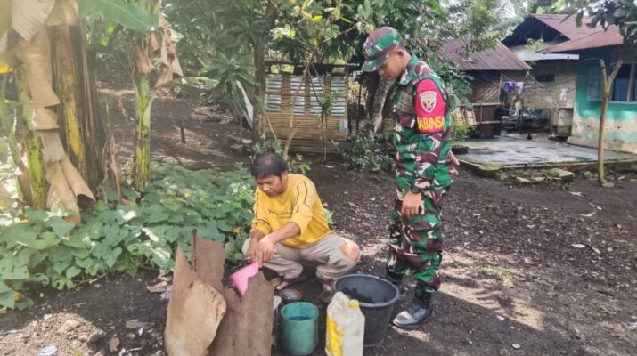 Rote Ndao – Babinsa Koramil 1627-01/Baa, Sertu Nelson Sine, bersama warga masyarakat Dusun Danoloin, Desa Suelain, Kecamatan Lobalain, melaksanakan kegiatan gotong royong membantu pembangunan