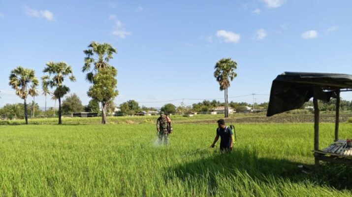 NTT-Sumba Timur.Dalam upaya mendukung ketahanan pangan dan membantu para petani, Babinsa Koramil 05/Waingapu Kodim 1601/Sumba Timur, Serka Antonius Kopa Rihi, turun langsung ke sawah