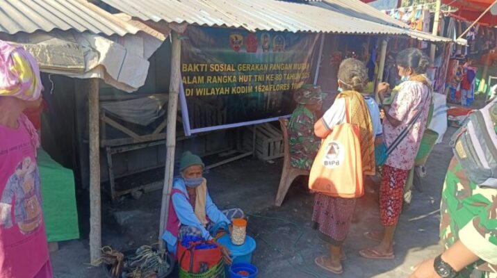 Larantuka, Kodim 1624/Flotim bekerja sama dengan Bulogmenyalurkan beras murah kepada masyarakat di Pasar Boru, Kecamatan Larantuka, Kabupaten Flores Timur. Senin (22/09/2025). Sebanyak 2,5 ton