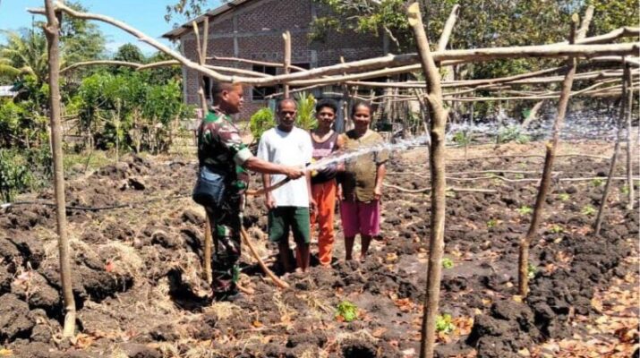NTT-Kefamenanu, Senin 29 September 2025, Dalam upaya mendukung program ketahanan pangan nasional, Babinsa Koramil 1618-04/Bisel, Serda Benediktus Nainatun, melaksanakan kegiatan monitoring wilayah sekaligus membantu