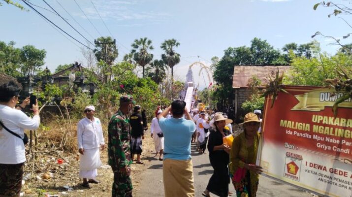 KARANGASEM – Babinsa Desa Dukuh Koramil 1623-08/Kubu Serma I Ketut Ariya melaksanakan kegiatan pengamanan upacara Pelebon alm. Ida Pandita mpu Nabe Parama Manik Gni