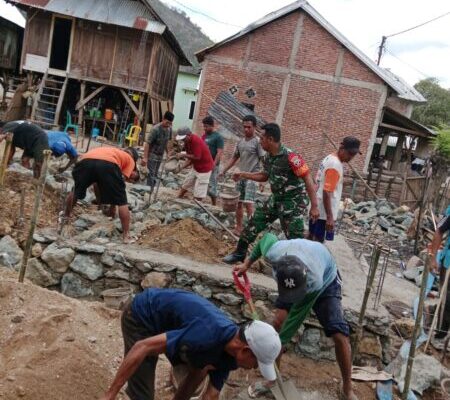 Palibelo _ Sertu Adhamuddin Babinsa Desa Ntonggu Koramil 1608-04/Woha bersama warga binaan melaksanakan kegiatan gotong royong pembuatan pondasi rumah bagi korban kebakaran di Desa