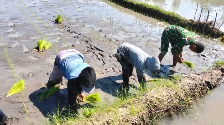 MANGGARAI TIMUR — Anggota Babinsa Koramil 1612-03/Borong, Pratu Muhamad Sukardin, menunjukkan wujud nyata kemanunggalan TNI dengan rakyat saat mendampingi para petani menanam padi di