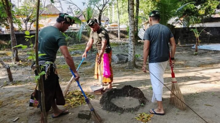 Klungkung,- Sinergitas dalam mewujudkan wilayah yang bersih dan sehat, Koramil dan Polsek Nusa Penida menggelar kegiatan gotong royong aksi bersih-bersih di Pura Dalem Penataran