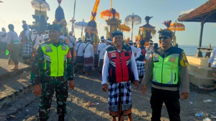 Babinsa Koramil 1616-01/Gianyar Atur Lalin Iring-iringan Upacara Mekiyis ke Pantai Lebih