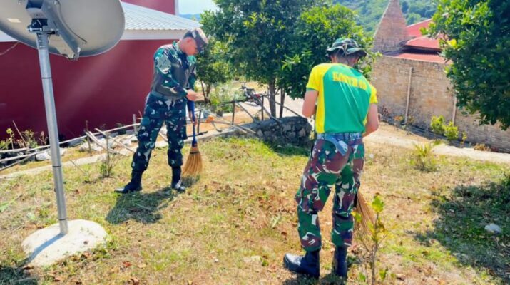 Wujud Kemanunggalan TNI–Rakyat, Satgas Pamtas Yonarmed 12 Kostrad Gelar Aksi Bersih di Gereja Laktutus