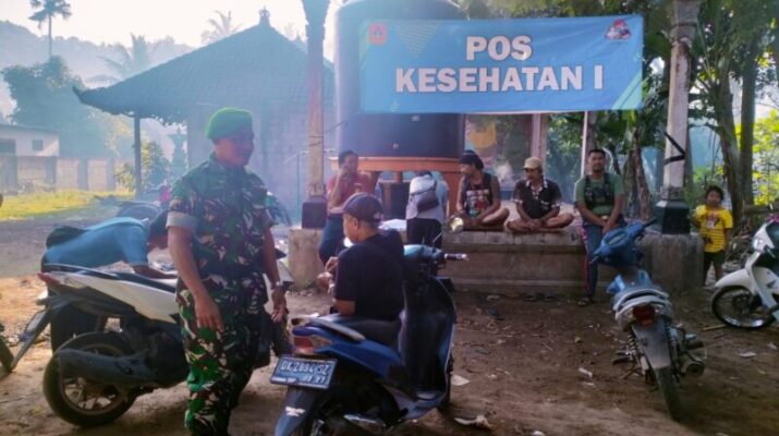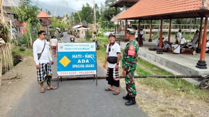 KARANGASEM – Babinsa Kelurahan Padangkerta Koramil 1623-01/Karangasem Peltu I Wayan Sumadra bersinergi melaksanakan pengamanan upacara Nyineb Piodalan Purnama Kapat, di Pura Puseh Desa Adat