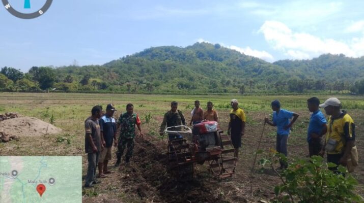 Ende, Dalam rangka mendukung ketahanan pangan dan memperkuat komunikasi sosial dengan masyarakat, Babinsa Koramil 1602-01/Ende, Serma Bambang Sutrisno, melaksanakan kegiatan pematokan saluran irigasi tersier