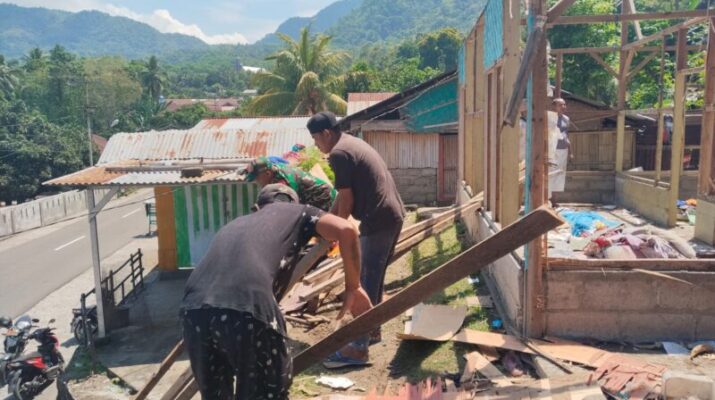 Gotong Royong Babinsa dan Masyarakat Woloare Bersihkan Puing Rumah Rusak