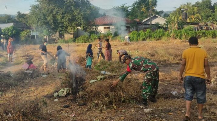 NTT-SIKKA. Babinsa Koramil 1603-04/Kewapante Kodim 1603/Sikka, Sertu Dedi Setiabudi, melaksanakan kegiatan karya bakti pembersihan di lapangan eks Pasar Geliting, Kecamatan Kewapante, Kabupaten Sikka. Kegiatan