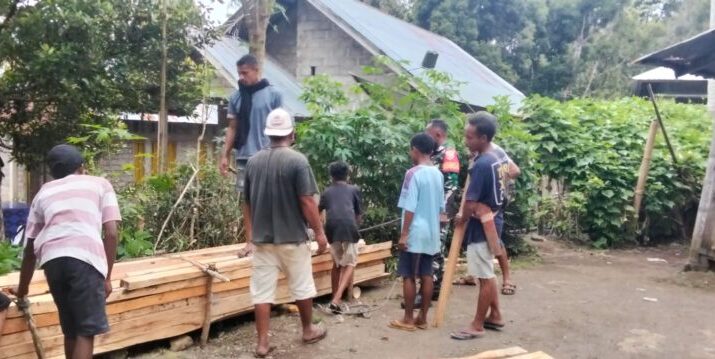 Flotim – Babinsa Koramil 1624-02/Adonara, Praka Fransiskus D. Payon, melaksanakan kegiatan komunikasi sosial (Komsos) sekaligus membantu pekerjaan pembangunan rumah warga di Desa Horowura, Kecamatan