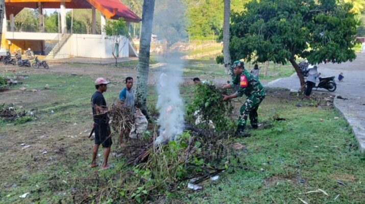 Sumbawa Barat — NTB, Dalam semangat kebersamaan dan kepedulian terhadap kebersihan lingkungan, Babinsa Desa Tamekan, Serda Zulkifli anggota Koramil 1628-01/Taliwang, melaksanakan kegiatan gotong royong