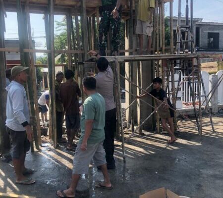 Dompu, NTB – Sabtu, 25 Oktober 2025, Babinsa Desa Mangge, Peltu Suratman, bersama Bhabinkamtibmas dan Kepala Desa melaksanakan kerja bakti pengecoran gapura Masjid Nurul