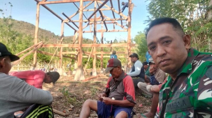 Sumbawa Barat – NTB, Anggota Koramil 1628-03/Seteluk, Babinsa Desa Seteluk Atas Sertu A. Gani, melaksanakan kegiatan gotong royong bersama warga dalam pembuatan rumah panggung