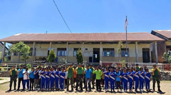 Belu, – Prajurit Pos Fohuk Satgas Pamtas RI–RDTL Sektor Timur Yonarmed 12 Kostrad melaksanakan kegiatan karya bakti bersama para siswa SMP Negeri Piebulak yang