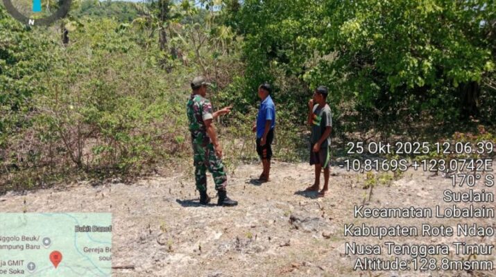 Rote Ndao – Babinsa Koramil 1627-01/Ba’a, Sertu Nelson Sine, melaksanakan kegiatan komunikasi sosial (komsos) sekaligus pendampingan pengecekan lahan milik Desa Suelain yang akan digunakan