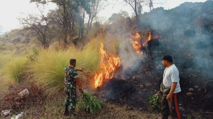 KARANGASEM – Babinsa Desa Datah Koramil 1623-02/Abang Serka Ketut Pica membantu proses pemadaman kebakaran lahan di Banjar Dinas Tegalanglangan, Desa Datah, Kecamatan Abang, Kabupaten