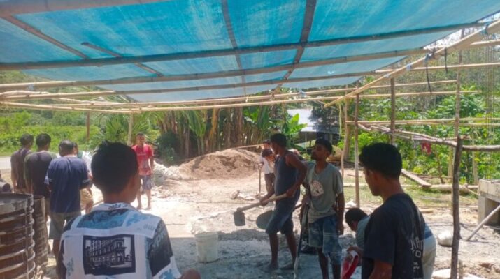 SUMBA BARAT – Babinsa Koramil 01/Loli Kodim 1613/Sumba Barat, Sertu Filomeno Dakosta, bersama warga masyarakat melaksanakan kegiatan gotong royong pengocoran pembangunan rumah milik salah