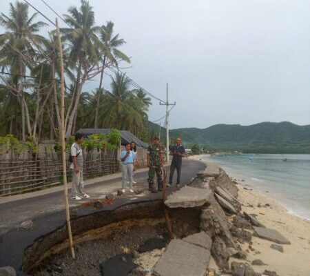 Akibat Ombak Besar, Babinsa dan Aparat Desa Cek Kondisi Tanggul di Labuhan Kertasari
