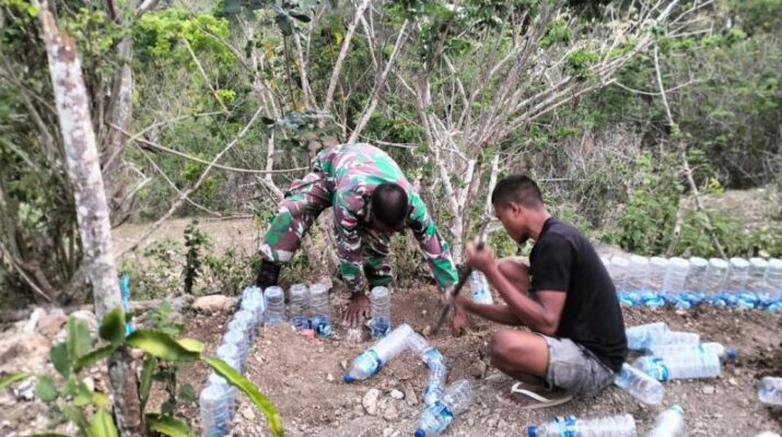 Kreatif dan Menarik, Anggota Satgaster Pos Fatubesi Bawah Bersama Warga Buat Taman Dari Botol Bekas