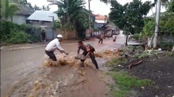 Aikmel, Lombok Timur — Babinsa Desa Kembang Kerang Induk, Koramil 1615-11/Aikmel, Koptu Moh. Ziadi, bergerak cepat bersama warga membantu mengatasi luapan air sungai yang