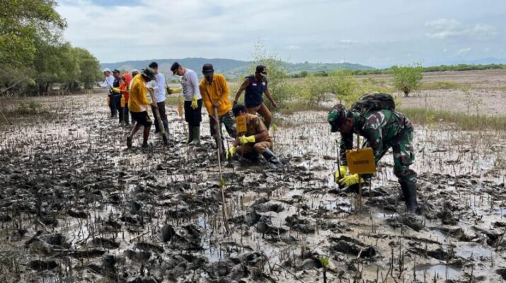 Sumbawa, NTB — Kodim 1607/Sumbawa melalui Koramil 1607-12/Moyo Hilir turut mengambil peran penting dalam kegiatan penanaman pohon mangrove bertajuk “Aksi Mitigasi Vegetasi Berbasis Ekosistem”