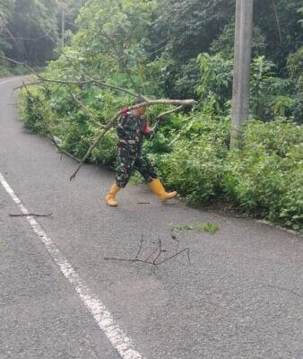 Sumbawa Barat, NTB — Tiga personel Babinsa dari Koramil 1628-02/Sekongkang melakukan aksi sigap membersihkan tumpukan ranting pohon dan semak-semak yang menutupi sebagian badan Jalan
