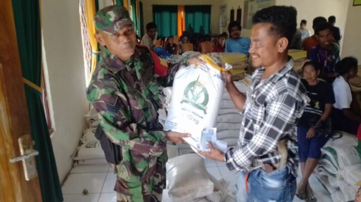 SUMBA BARAT – Babinsa Koramil 02/Walakaka Kodim 1613/Sumba Barat, Serka Muslih, melaksanakan pendampingan penyaluran bantuan sosial (bansos) berupa beras dan minyak goreng kepada masyarakat