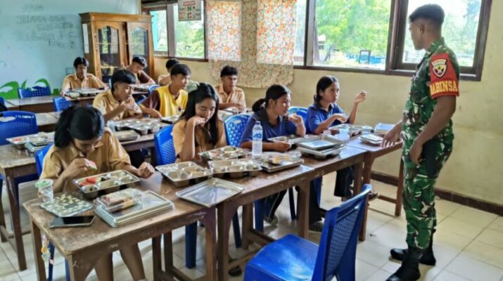 NTT – Sumba Timur. Babinsa Pahunga Lodu, Koramil 02/Rindi Umalulu, Kodim 1601/Sumba Timur, Pratu Dendi Djami, melaksanakan pendampingan kegiatan MBG di SMA Negeri 1