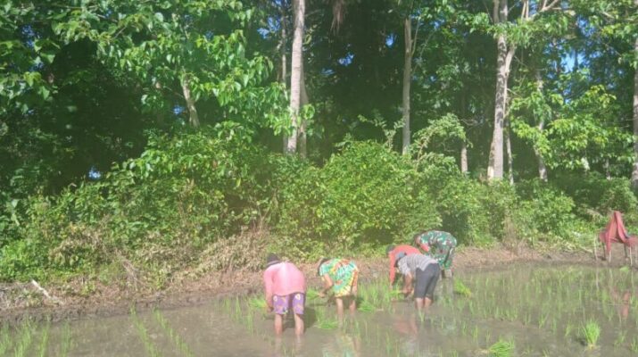 NTT – Sumba Timur. Babinsa Koramil 04/Tabundung, Kodim 1601/Sumba Timur,Pratu Denis N.P, melaksanakan kegiatan pendampingan ketahanan pangan (Hanpangan) berupa tanam padi bersama masyarakat di