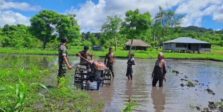 NTT – Sumba Timur. Memasuki musim penghujan, Babinsa Koramil 06/Karera jajaran Kodim 1601/Sumba Timur, Sertu Junus Ratu, terjun langsung ke sawah membantu warga menyiapkan