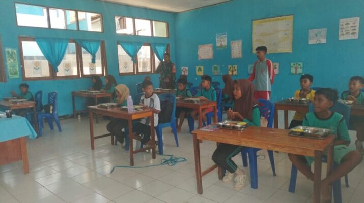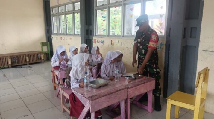 Sumbawa Barat, NTB – Babinsa Desa Seteluk Tengah Koramil jajaran Kodim 1628/Sumbawa Barat, Sertu Dahlan, melaksanakan pendampingan Program Makan Bergizi Gratis (MBG) di SDN