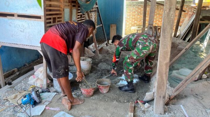 Lembata – Sebagai bentuk nyata kemanunggalan TNI bersama rakyat, Babinsa Koramil 1624-04/Omesuri Praka Juphry melaksanakan kegiatan karya bakti membantu masyarakat yang sedang membangun rumah